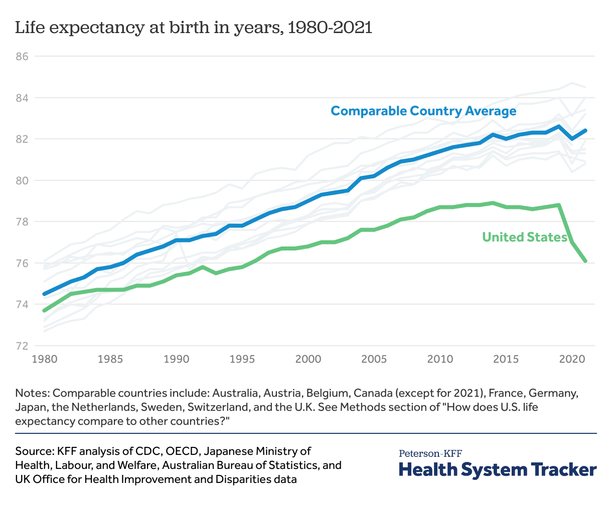 For example, a statistic from the Health System Tracker compared the United States’ life expectancy rates at birth compared to other countries. The image speaks for itself: